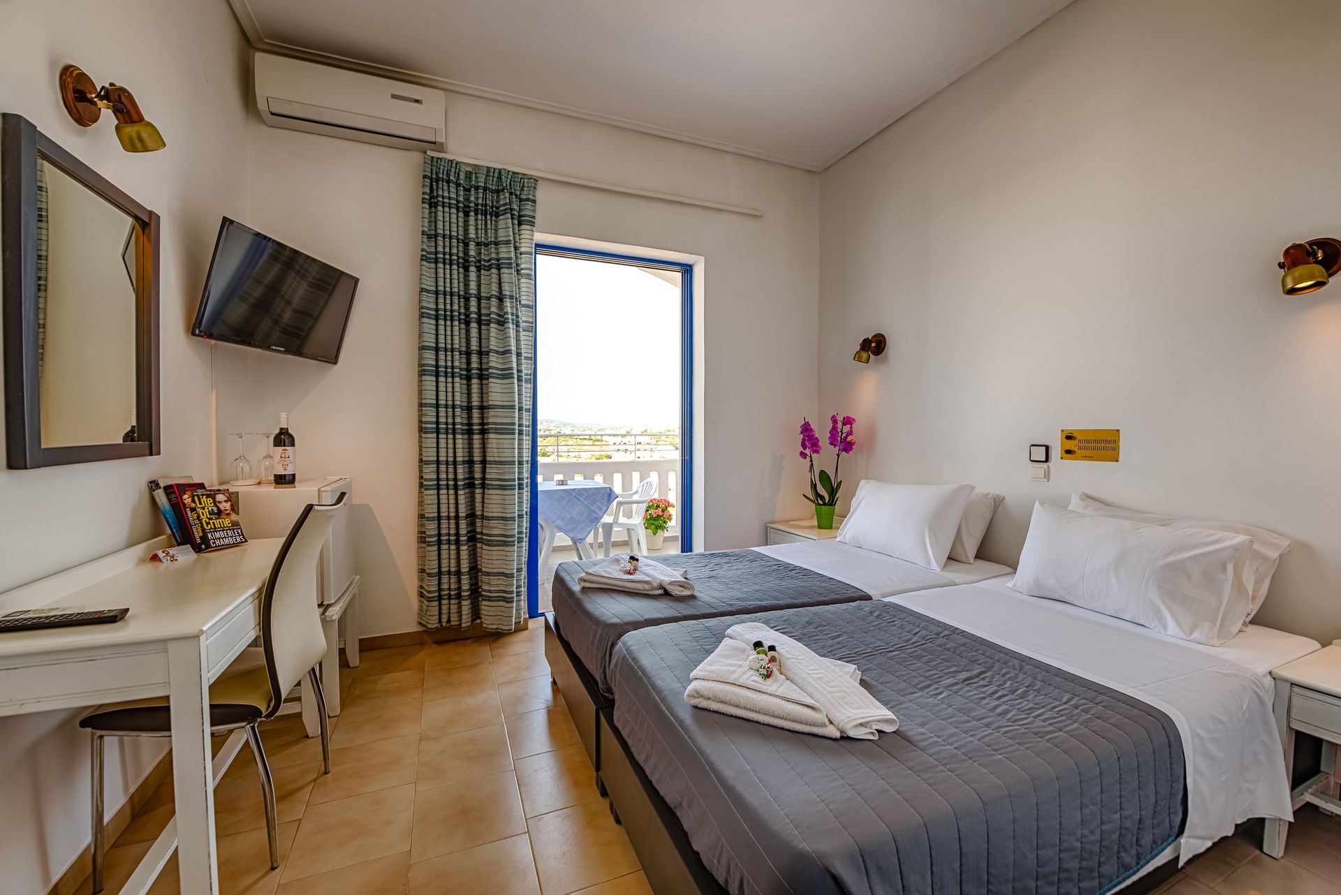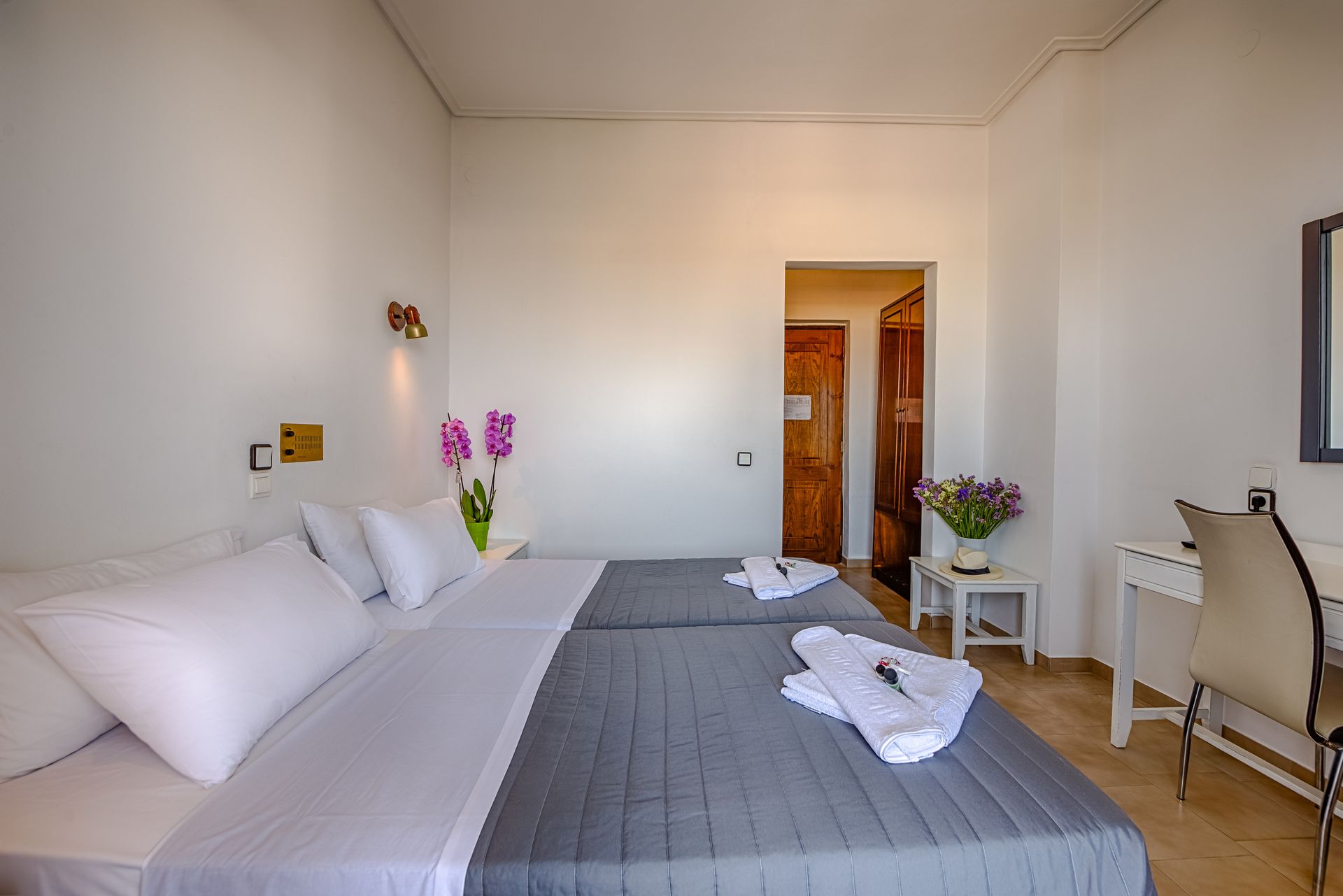 At Hotel Alexis, guests enjoy comfortable, bright, and well-appointed rooms designed to enhance relaxation during their stay in Chania. Every room includes a private balcony with sweeping views of the sea, the mountains, or Chania Town, offering a serene backdrop for your holiday. Rooms are equipped with air conditioning, mini-fridge, safe box, complimentary Wi-Fi, and quality bedding for a restful night’s sleep. Whether you are visiting Chania for leisure, business, or a romantic escape, Hotel Alexis offers exceptional value and comfort among hotels in Chania Crete, with room categories suited for couples, families, and solo travelers.