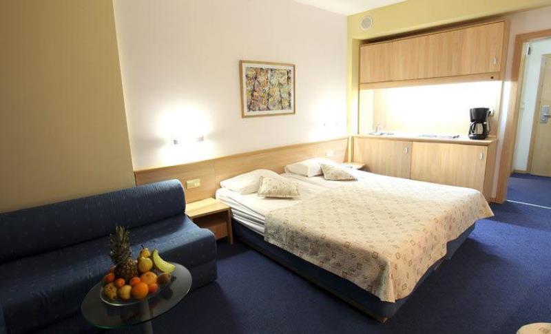 Hotelul are 6 lifturi si 5 etaje pe care sunt dispuse 176 studiouri dotate cu: